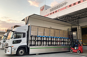 Since the 2000s, the Sapporo Group has been promoting the joint transportation of goods with companies inside and outside the industry, working to reduce environmental impact through improved vehicle loading rates and reduction in the number of vehicles.