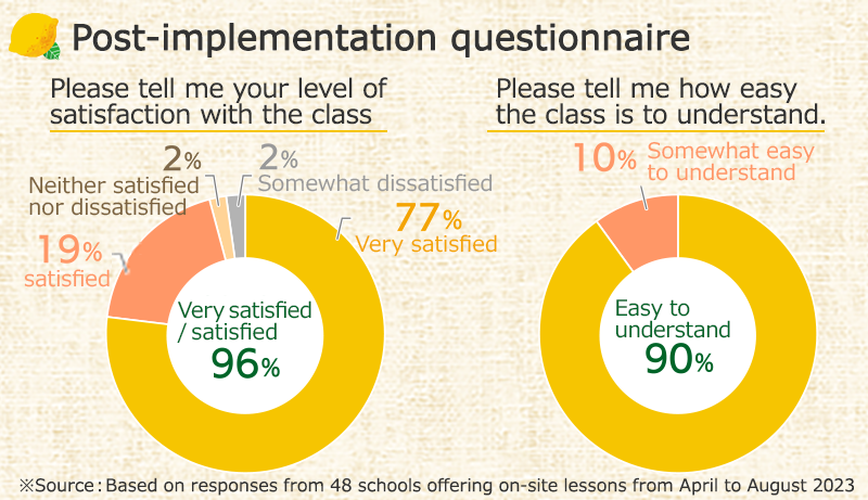 POKKA SAPPORO Food & Beverage began full-fledged delivery of the classes in 2022 and conducted them at more than 100 schools during 2024, as in 2023. In post-class surveys of teachers and school staff, the program received high ratings in terms of satisfaction, ease of understanding, and other factors.