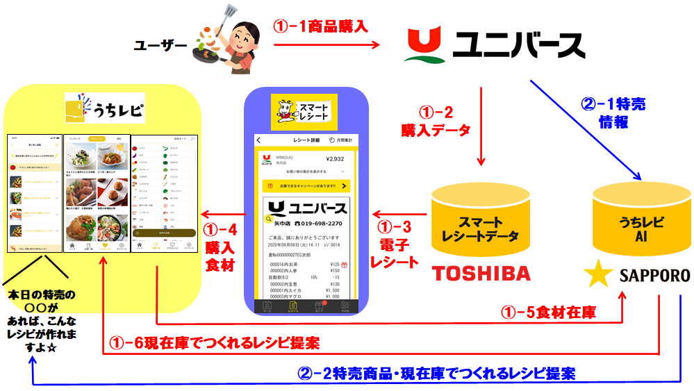 「うちレピ」は、電子レシートがスマートフォンに届くレシート管理アプリ「スマートレシート」を運営する東芝テック・東芝データと、青森・岩手・秋田でスーパーマーケット「ユニバース」を展開するユニバースと連携し、2021年6月19日~8月22日の期間において、「①購入情報連携」「②買足し提案連携」に関する実証実験を「ユニバース」全店舗(ビッグハウス湊店除く)で行います。ユーザーは「ユニバース」の店舗で購入した食材情報をスマートレシートを介して「うちレピ」に登録することで、自宅食材と合わせてつくれるレシピの提案を受けることができます。さらに、「うちレピ」から「ユニバース」の特売食材でつくれるレシピをリアルタイムに提案します。