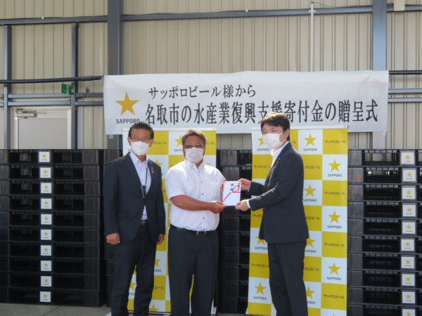 サッポロビール(株)は、宮城県漁協仙南支所(閖上)に対し、東日本大震災で甚大な被害を受けた水産業復興のため、スカイタンク2台・パレット50枚の購入費用を寄付しました。