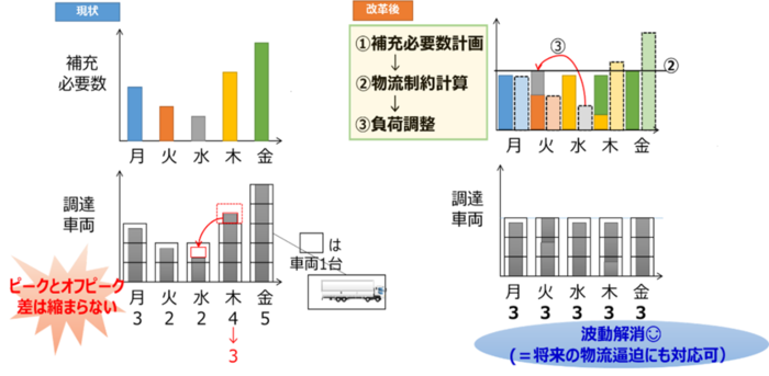 (注2)物量の平準化を目的に、生産計画の見直しを行うためのシステム。3ヶ月先の需要を見て生産計画を見直し、工場発倉庫間および倉庫間の幹線輸送の出荷台数の平準化を図り、工場及び倉庫の混雑回避につなげることで、車両の待機時間削減を実現。