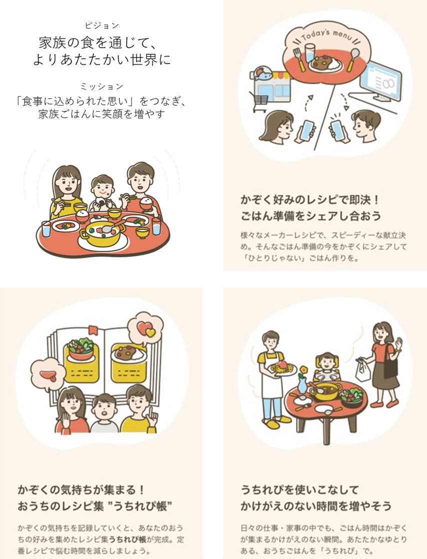 「うちれぴ」は、「家族の食を通じて、よりあたたかい世界に」をビジョンに掲げ2021年1月にβ版webアプリ(注3)を立上げ、「『食事に込められた思い』をつなぎ、家族ごはんに笑顔を増やす」をミッションと定めています。これまで生活者の家庭での料理に関するニーズの検証、および料理に関連する一連の体験をシームレスにつないだ、フードテックサービスの構築を目指した実証実験を行ってきました(注4)。これらの検証結果を踏まえ、この度の正式版アプリでは