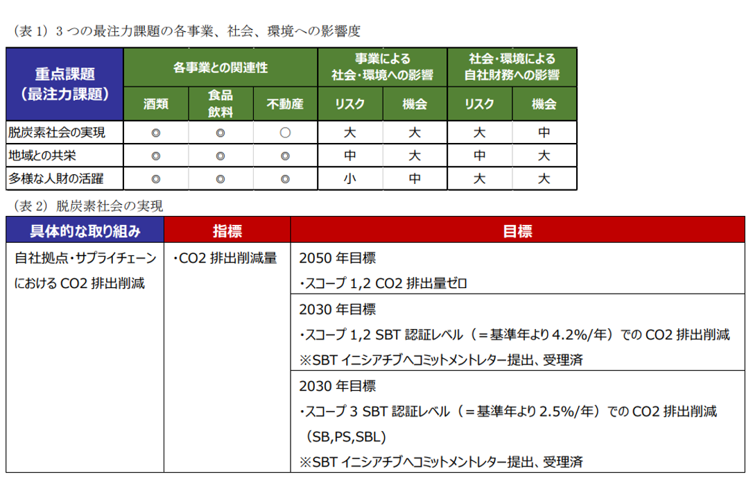 サッポロホールディングス(株)は、中期経営計画(2023~26)の策定にあたり、グループを取り巻く社会情勢や事業環境の変化に対応してサステナビリティ重点課題を全面的に見直しました。