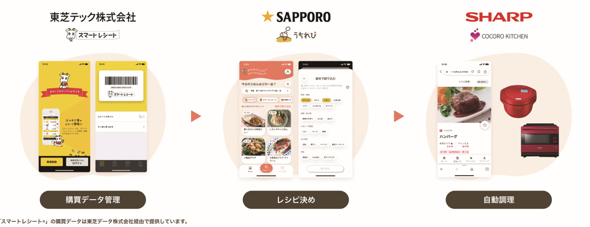 サッポロホールディングス(株)、東芝テック(株)、および東芝データ(株)は、料理に関する一連の体験をシームレスにつないだフードテックサービスの構築を目指し、サッポロホールディングスが運営するスマートフォン向けアプリ「うちれぴ」と、東芝テックが開発・運営し、東芝データが運営を支援している電子レシートサービス「スマートレシート®」(注1)が連携したサービスを、12月13日より開始しました。