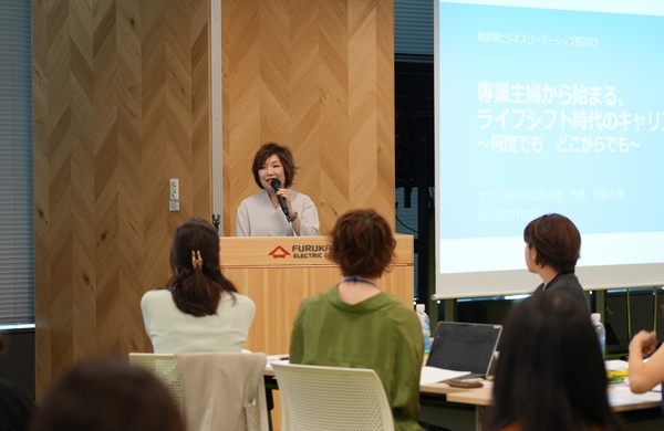 第1回プログラムは集合研修として古河電工本社にて開催し、基調講演、ネットワーキングランチ、パネルディスカッション、グループワークを実施しました。基調講演では、富士古河E&C株式会社社外取締役、株式会社良品計画社外取締役等の伊藤久美氏が「ライフシフト時代のキャリア」をテーマに登壇し、キャリアの考え方、リーダーシップについて経験を語りました。グループワークでは、自身の振り返りと今後のありたい姿についてディスカッションし、他社の参加者と交流を深めました。