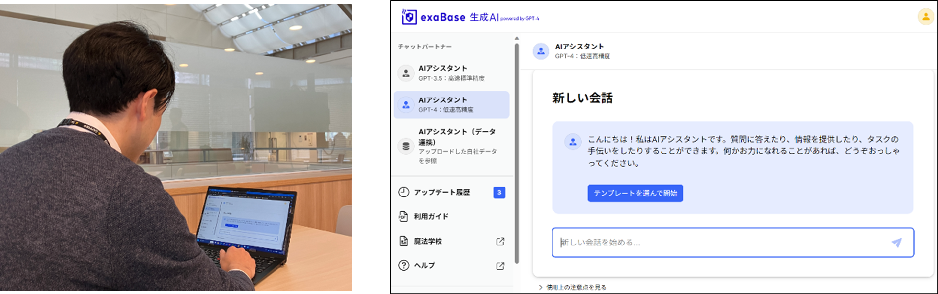 「exaBase 生成 AI」はMicrosoft社が提供するGPTモデルを利用するSaaS形式のサービスであり、今回の試験導入では、インプットデータが学習に利用されないこと、入力ログなどが確認できる管理ダッシュボードを持つことを踏まえ、同サービスを採用しました。
