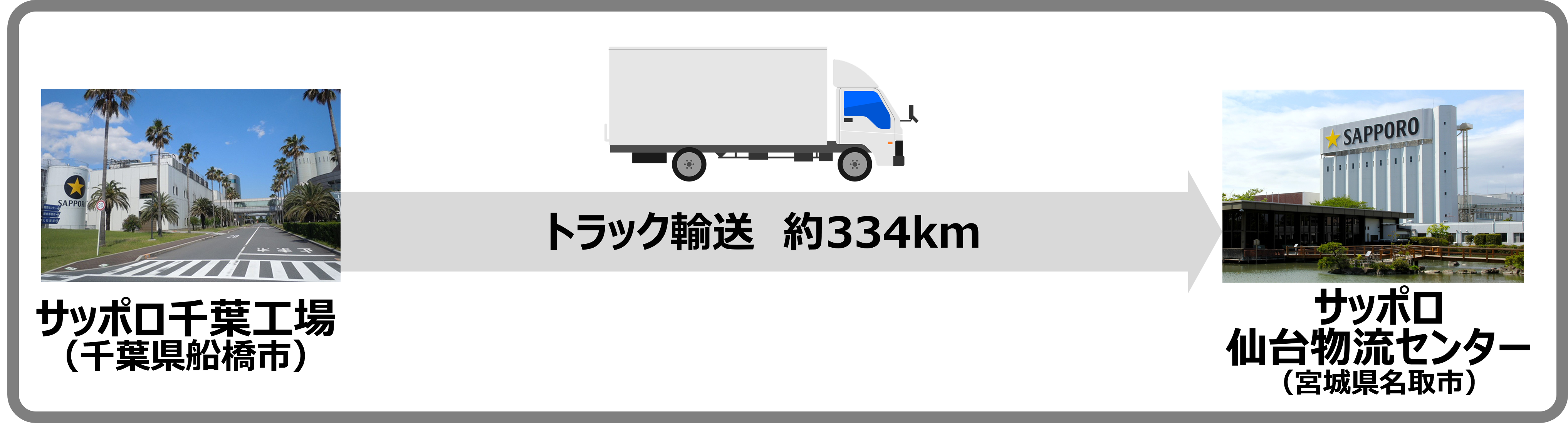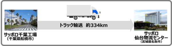 サッポロビール千葉工場(千葉県船橋市)→JR貨物隅田川駅(東京都荒川区)→JR貨物仙台貨物ターミナル駅(宮城県仙台市)→サッポロビール仙台物流センター(宮城県名取市)