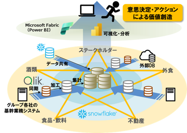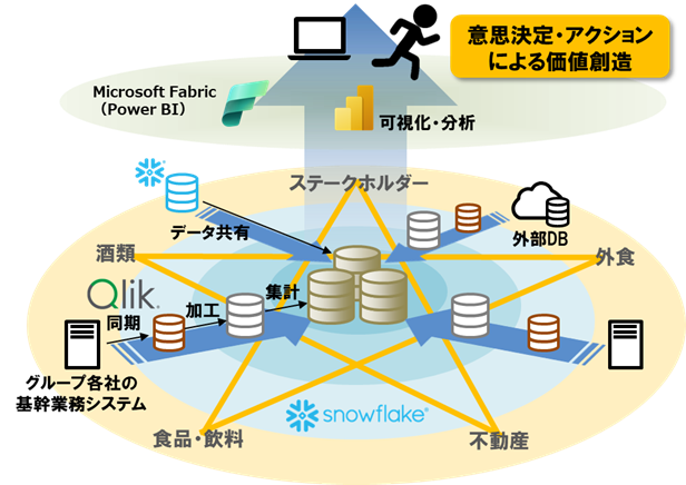 今後はこのデータ基盤システムを軸に、ステークホルダーに関わるデータや、酒類事業や食品・飲料事業の出荷データ、飲食店事業の飲食動態データに加えて、気象情報などのオープンデータに対して社員が容易かつ安全にアクセスできる仕組みの構築やデータベースの拡大を推進し、社会環境の変化に柔軟に対応するための環境を整備します。各社・各部門における意思決定の迅速化・高度化を促進することによる価値創造や、様々なビジネス課題の解決に貢献します。
