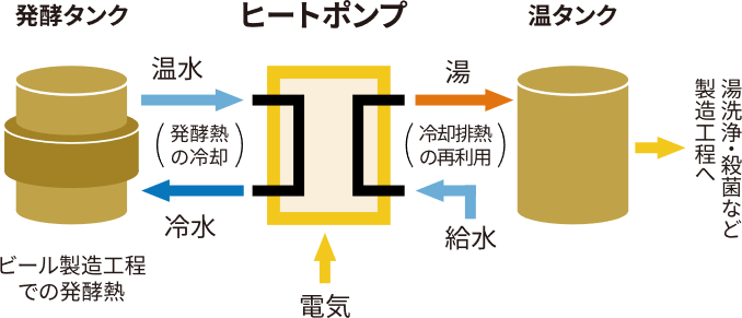 これまで活用できていなかった排熱(未利用エネルギー)を回収し、ビール製造工程や環境負荷低減工程(廃水処理)での熱源として有効活用を進めています。ビール醗酵熱、煮沸工程排熱、燃焼排熱、機械排熱、廃水処理水排熱といった未利用エネルギーの活用により、湯等の加温で使用していたエネルギーを削減しました。