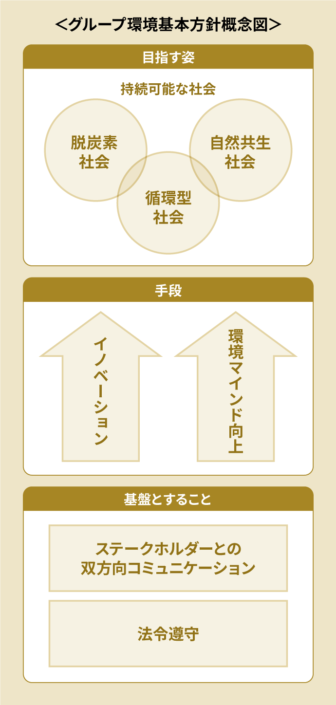 私たちは、環境をグループ全体の重要な経営課題と認識し、一人ひとりが、それぞれの強みを最大限に発揮し、主体的・継続的に取り組みます。